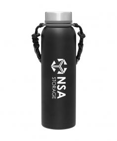 32 oz double wall 18/8 stainless steel thermal bottle with copper vacuum insulation, insulated stainless steel threaded lid, silicone ring, removable strap with buckles, removable clasps, and powder coated finish. Individual gift box. Hand wash recommended. Do not microwave. Complies with FDA, Prop 65. 11" H x 3.1875" W