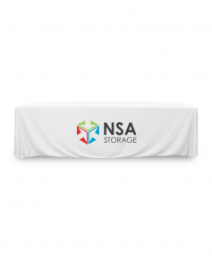 8 ft. Premium PolyKnit throw table cover with one color logo. Fits a 96 inch wide x 30 inch deep table. All corners are rounded meaning they will not gather and lay on the floor. Floor length on 4 sides. This cloth requires no ironing, is EasyCare machine washable and dryer safe.