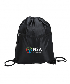 Sport bag with a contrast color front-zippered pocket, reinforced corners and a drawstring closure. Drawstrings double as backpack straps. 12 1/2" W x 15 1/2" H x 3/16" D.