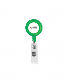 The Delfino round badge holder has a 36" retractable cable and crocodile clip on the back side. Complies with Prop 65. 1 1/4" W x 3 3/8" H x 3/4" D